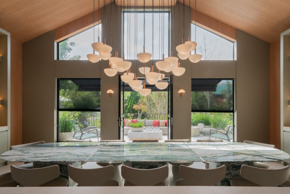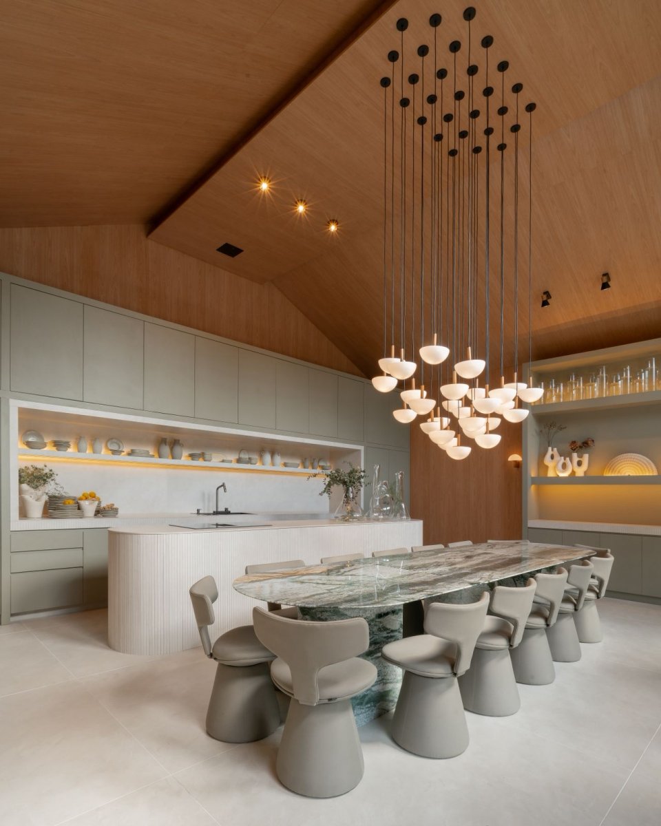 Com uma paleta em tons de verde e amadeirado, que traz equilíbrio e aconchego, o projeto reforça a conexão com a natureza e com o entorno em que está inserido. A pedra surge em pontos importantes, como na bancada de preparo, na ilha e na mesa central, trazendo sofisticação e atemporalidade ao espaço. Cada detalhe foi cuidadosamente pensado para valorizar tanto a estética quanto a experiência do usuário: a bancada de preparos e a ilha de cocção em Dekton traduzem praticidade no uso, enquanto a mesa central em mármore verde sete mares, colocada como ponto focal, simboliza o gesto de reunir pessoas em torno da comida e da conversa.