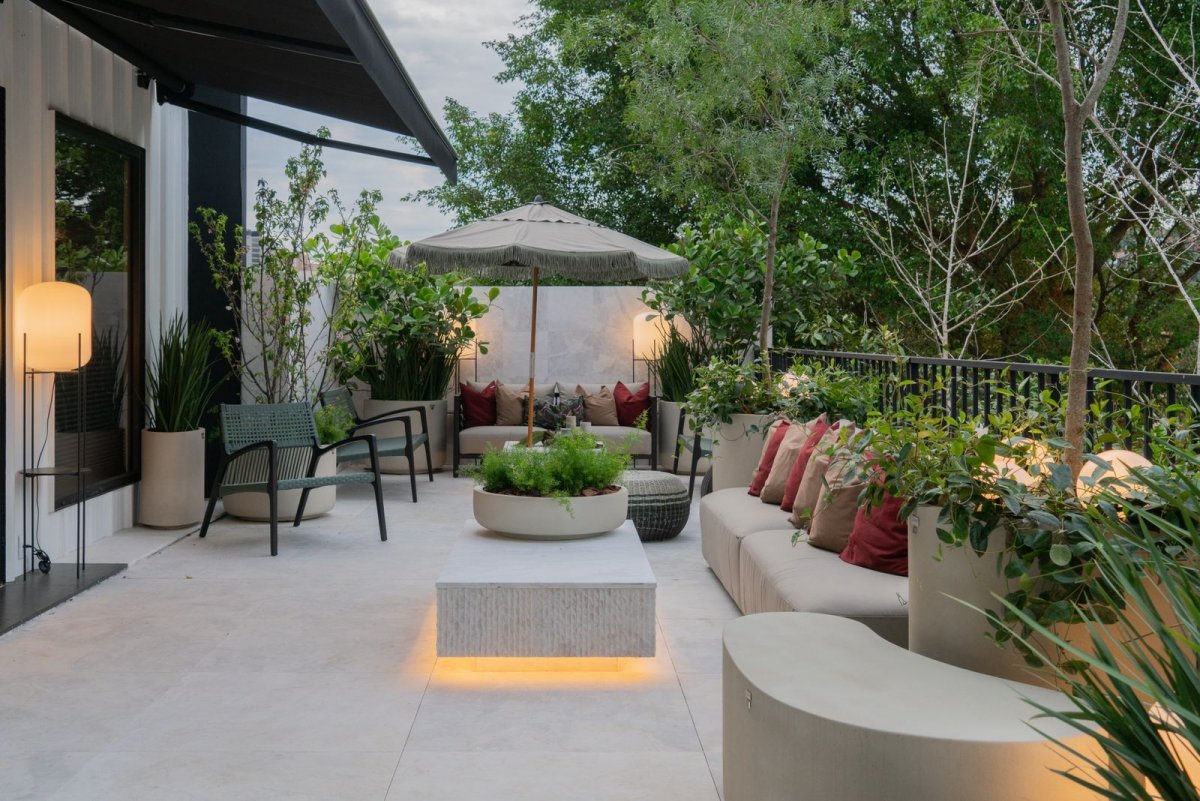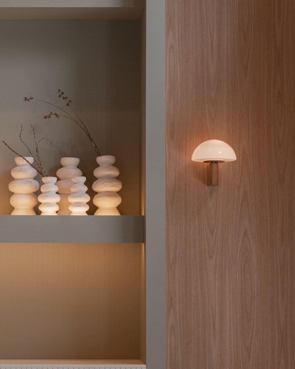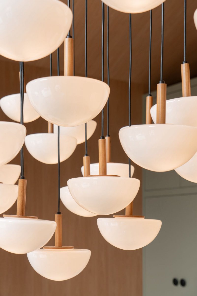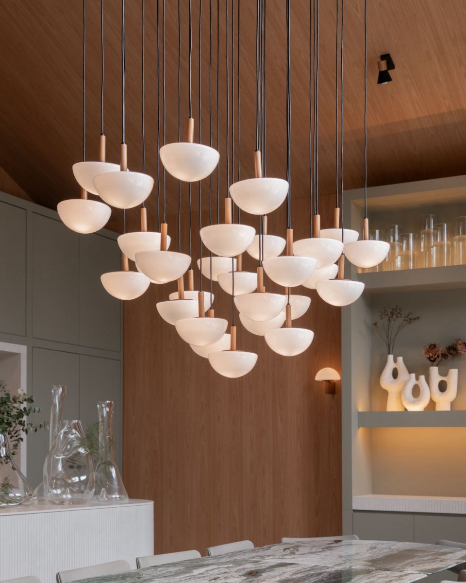 Nesse contexto, a iluminação foi escolhida para ir além da função, atuando como elemento de conexão e identidade. As peças da Linha Esther, em versão abajur e luminária de piso, trazem um design atemporal com vidro branco e estrutura em metal preto, acrescentando sofisticação e leveza ao espaço. Já a Linha Cogumelo, presente nos pendentes, arandelas e espeto para jardim, foi selecionada para integrar interior e exterior de forma fluida, inaugurando uma coleção que valoriza o artesanal e a brasilidade. Com vidro leitoso soprado manualmente e detalhes em madeira, a coleção traduz conforto, organicidade e unidade, reforçando a proposta do projeto de criar ambientes acolhedores e cheios de personalidade.