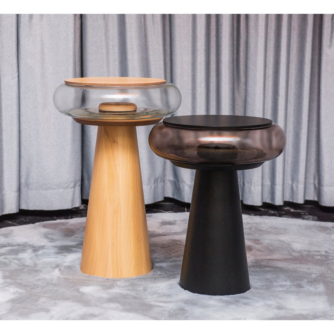 Sua base cônica em madeira sustenta um vidro soprado com formato abaulado, criando um jogo visual leve e fluido.