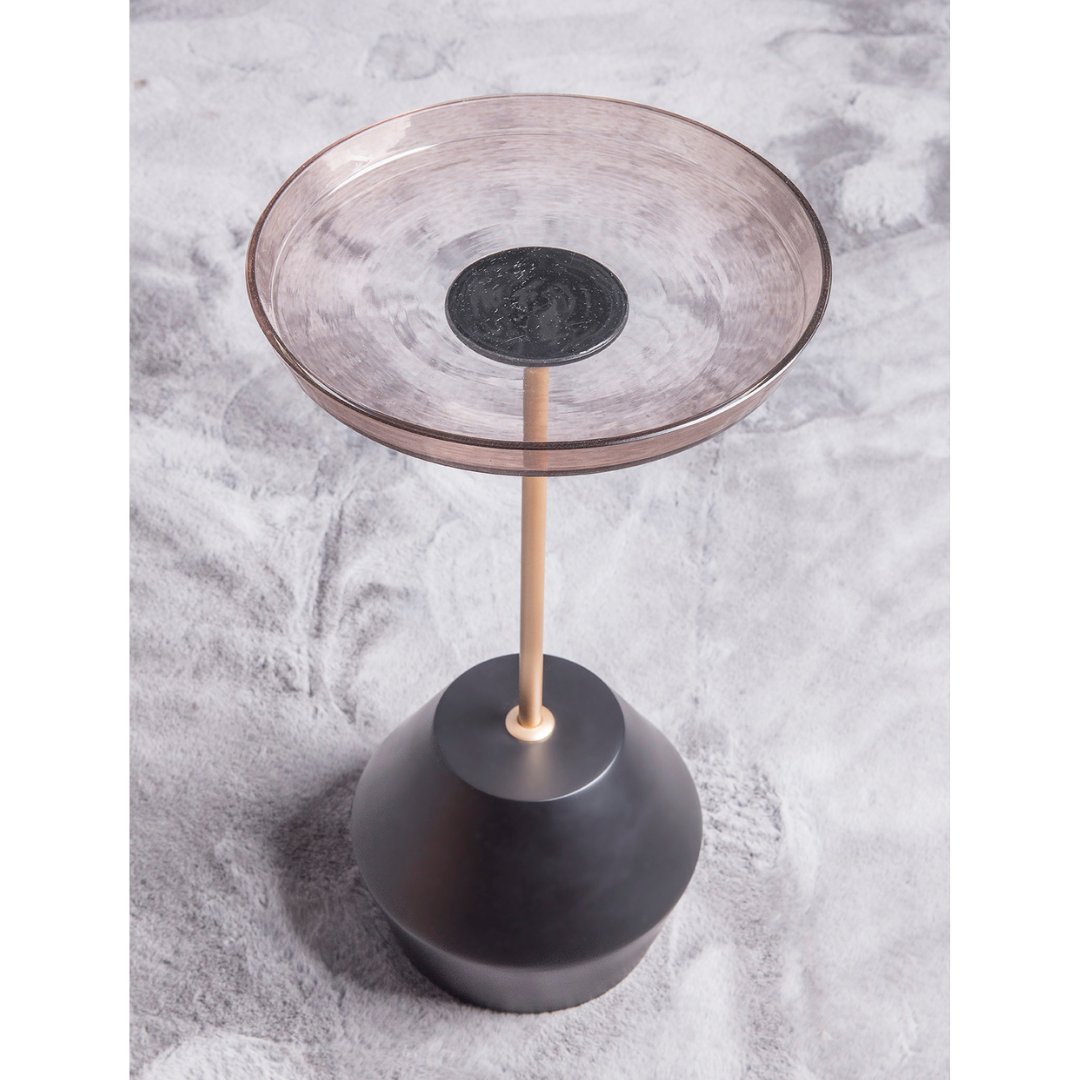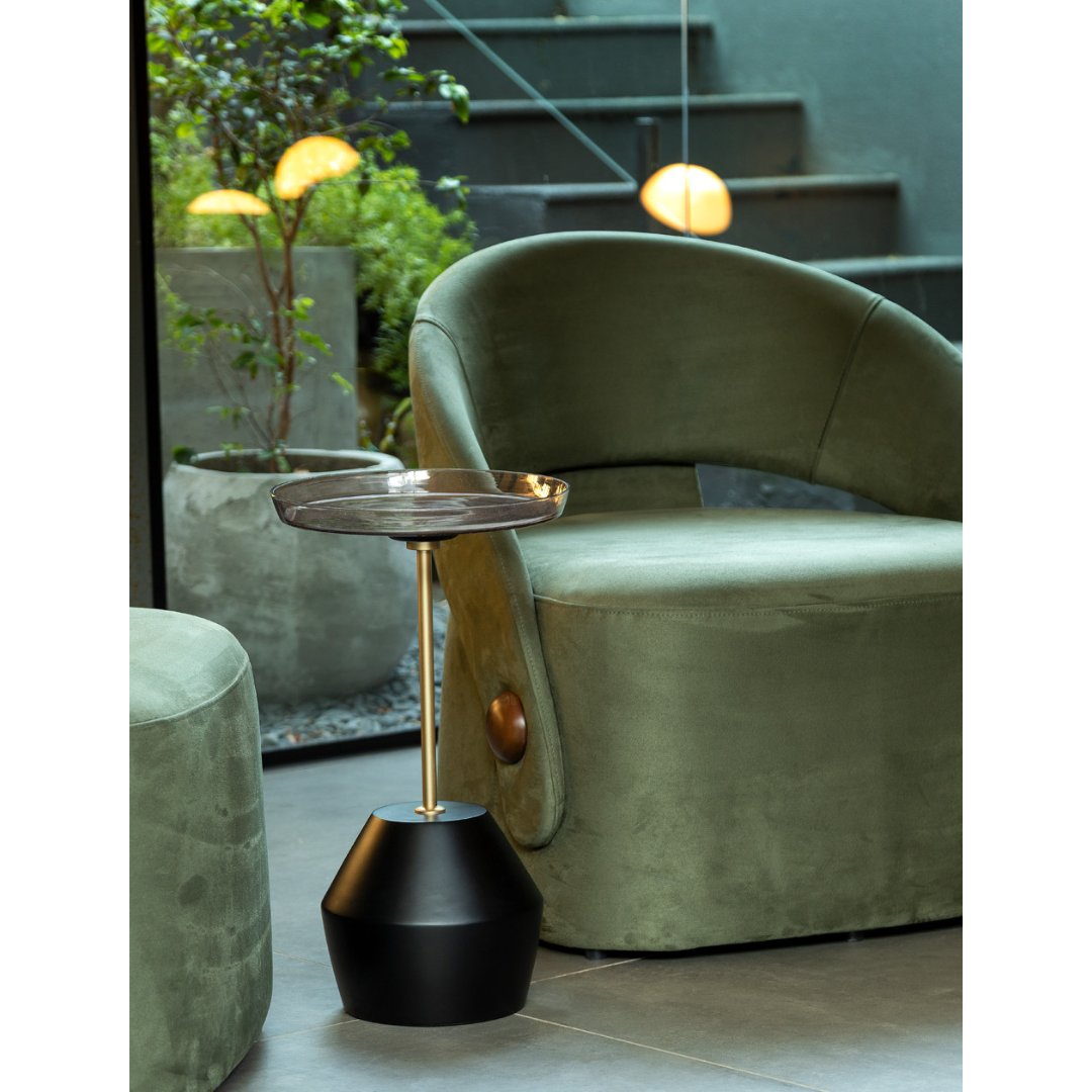 A Mesa Lateral Fler revela sua forma singular através do tampo de vidro soprado, como uma bandeja que captura a suavidade de uma gota caindo na água e esculpe com precisão suas curvas delicadas e orgânicas.