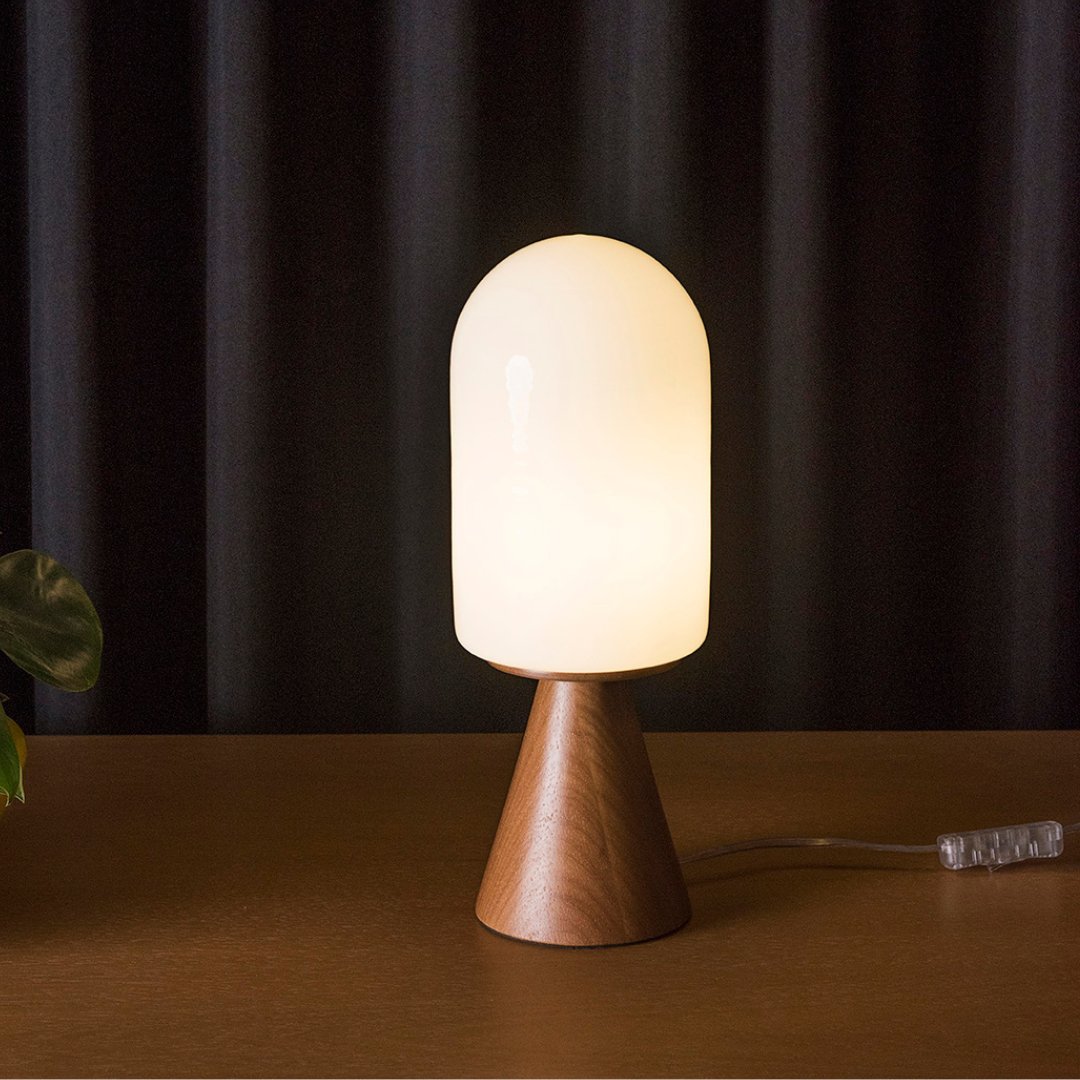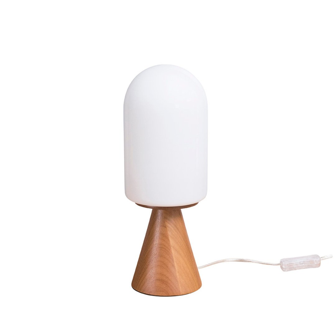 Com vidro leitoso e base em madeira, a Coleção Tulipa traz