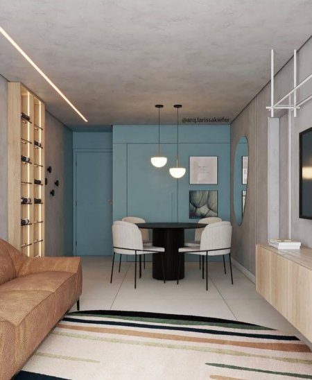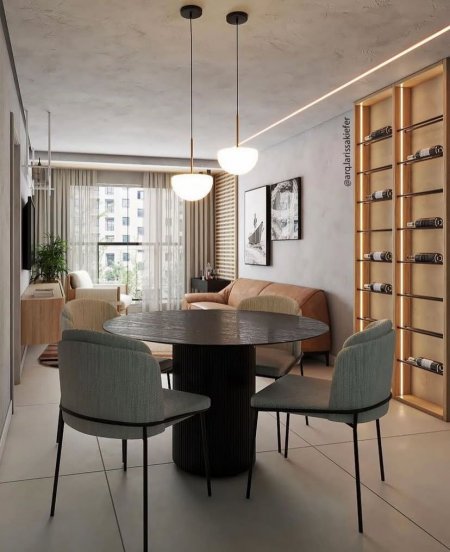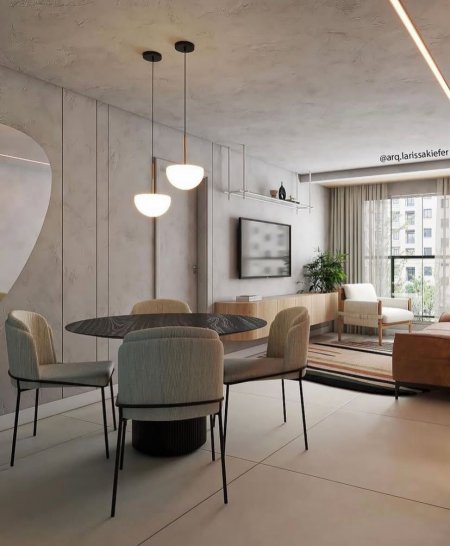 O projeto valoriza a integração entre sala de estar e jantar em um ambiente contemporâneo, com tons neutros e toques de cor que transmitem leveza e sofisticação. O pendente Cogumelo foi escolhido como destaque sobre a mesa de jantar, trazendo suavidade com seu design orgânico e luz difusa que cria uma atmosfera acolhedora. Sua forma arredondada dialoga com o mobiliário e complementa a composição, funcionando como elemento funcional e ao mesmo tempo decorativo, reforçando a identidade elegante e aconchegante do espaço.
